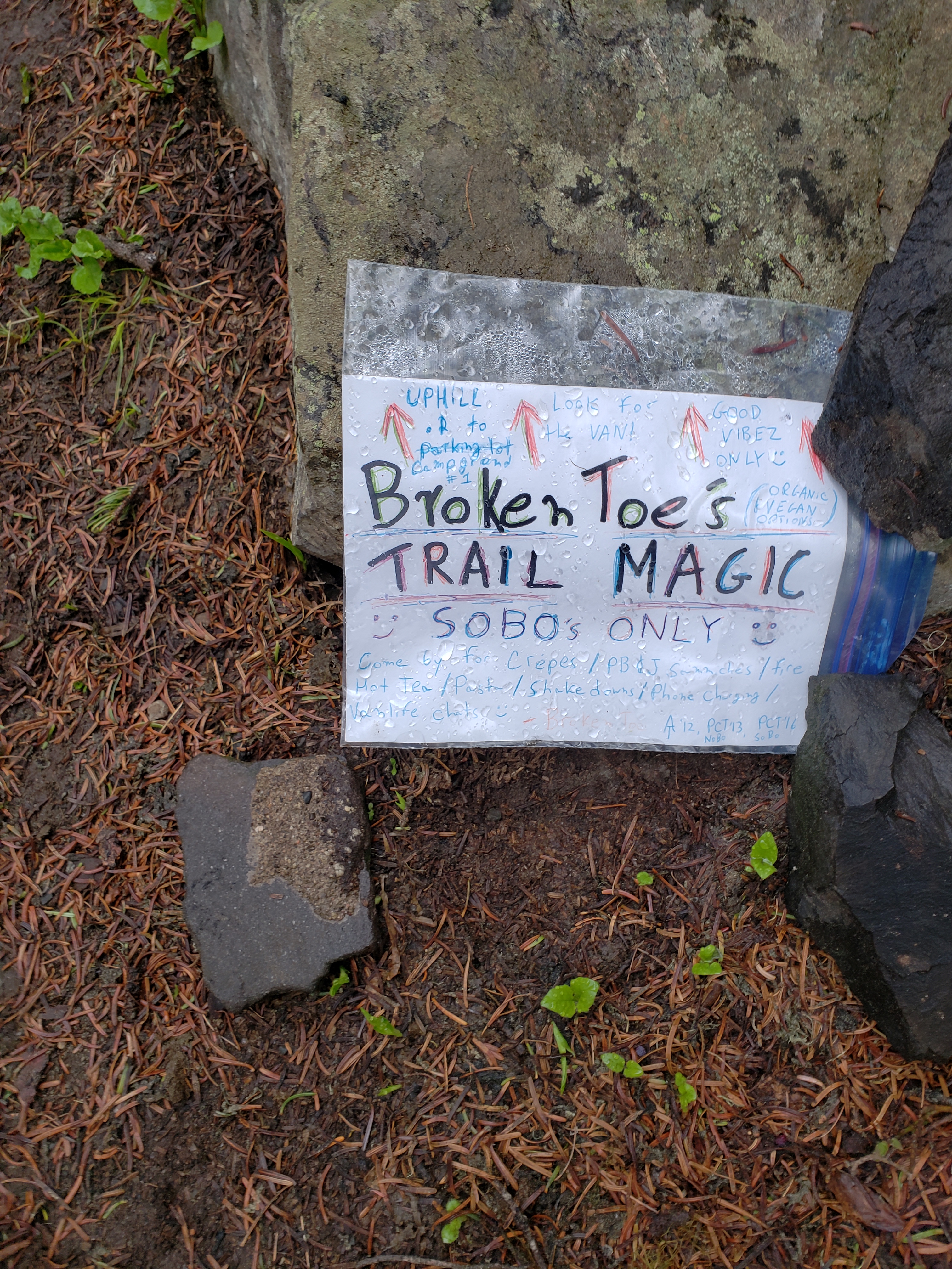 At Harts Pass another trail angel named Broken Toe let us stay in his campsite, made us a spectacular fire, and let us partake in some of his hiker box treasure. Broken Toe was the consummate dirtbag, a retired two something who lived in a decked out van full time. He’d previously hiked the PCT twice, once NOBO, once SOBO, and had come to the pass to help out a friend weeks ago. He had stayed there since, aspiring to provide trail magic for every SOBO that passed through.
