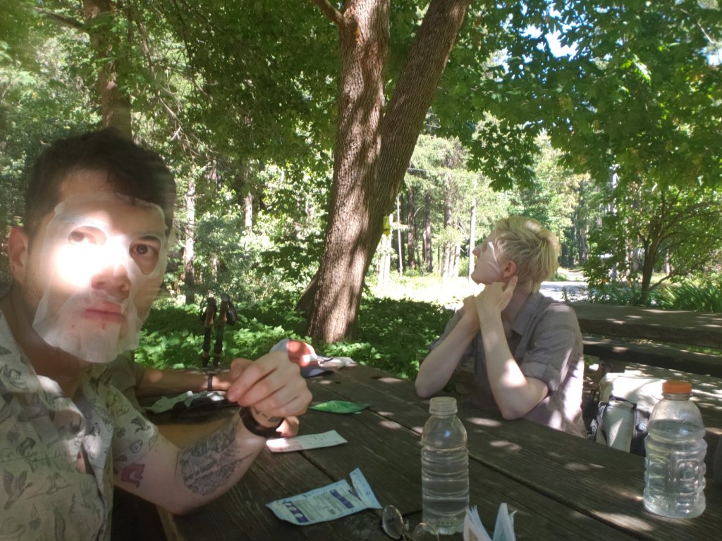 The four of us hung out for a few hours playing bananagrams and eating and talking about the trail, about gear, about ourselves. It was hot again and we were grateful not have hiked too much. Skybird sent herself some face masks and had an extra one so of course I tried it out. Treat yo self.