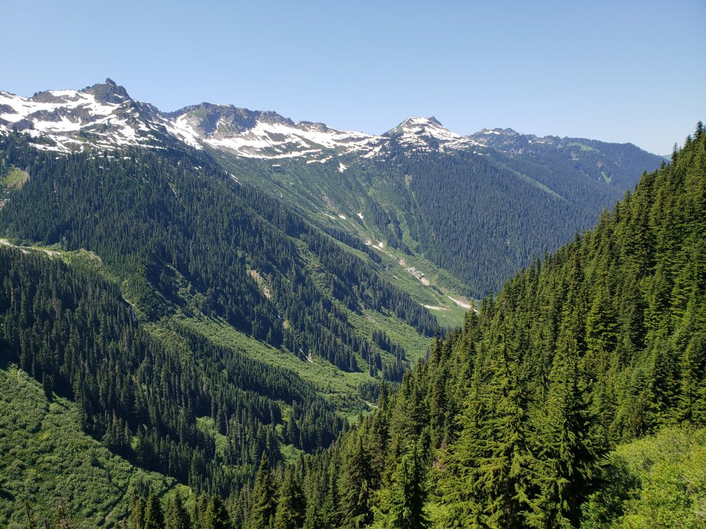 Around 4k feet we got in some big patches of snow that eventually turned into big snow fields and the last mile was mostly covered in snow. Had to cross a few sketchy looking snow bridges over fast moving streams. They held out okay but looked dangerous.