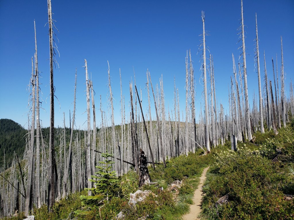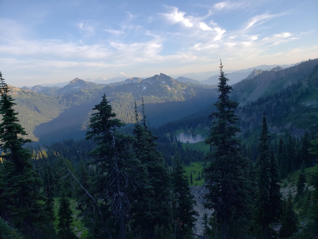 Kept hiking along ridges and got my first view of Mount Hood. It’s amazing seeing it for the first time. I may have seen it before though and not have known it. This time I’m sure of it though. Wait just double checked my earthmate, it’s probably not Mt Hood, it’s probably Mt Adams which makes more sense. Mt Hood is still a long ways away though maybe not that long. Anyway it was still amazing seeing too giant snowy mountains. There were a lot of points where I could see both Mt Rainer and (apparently) Mt Adams.