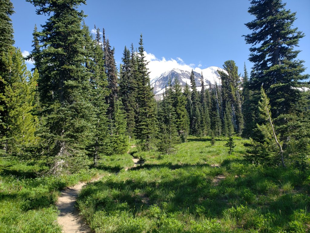 There’s a beautiful meadow with great views of Mt Adams right under a waterfall. I’m currently sitting in my tent listening to the waterfall looking up at Mt Adams swapping a few bugs reading Walden more content than I have ever felt.