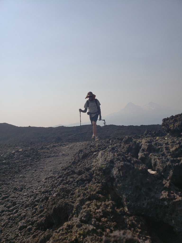 Hiked through more dry burn area before making it to the lava fields. The lava fields were intense. They started off easy though uphill but then turned into straight up lava fields with miles and miles of dry exposed lava rocks. Hiking early wasn’t too bad though I wish I had done like BK and started earlier. It was around 10 when I hit most of the big fields and I definitely felt the heat already. Got my first view of the Three Sisters mountains though it was very hazy from all the fires.
