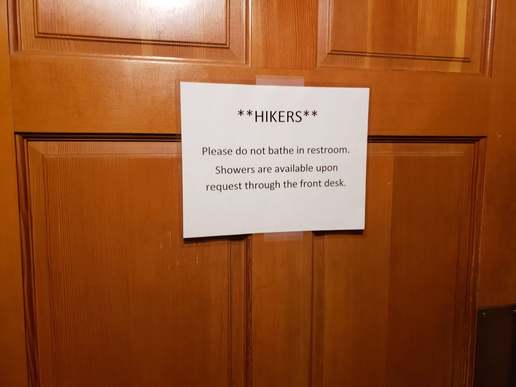 I washed up a bit in the bathroom. There was a sign that asked hikers not to bathe there. Apparently I was not the only one who has ever freshened up there. Got some overpriced fries and talked to Taylor for a bit and then Mup showed up.