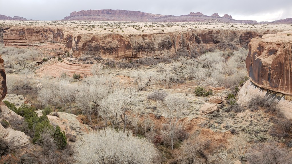 We got ahead of them and started no working our way down some narrowing canyons towards the Courthouse Wash, the big attraction of the day. Right before the start, there was a big pool of water we’d have to wade through to make it into the wash. Since it just rained and snowed the day before, we figured that the wash would probably be full of pools like this and since it was like 30 degrees, we really didn’t want to get wet. So from that point we found an easy spot to scramble up above the wash. There is an alternate further up that it is supposed to be much easier but it cuts through a lot of crypto biotic soil, living soil that is very delicate. A few blogs I read before encouraged people to avoid the alternate to stay off the soil so we were very hesitant to go up. Turns out it was actually fine to up near the edge of the wash since that was mostly hard rock with very little crypto soil.
