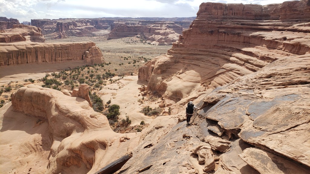 After a lot of easy hiking on the rocks, we rejoined the alternate and started the scramble down to the wash. From above we saw the three other hikers who it seemed had just taken the direct route. We were able to follow behind them, getting a little beta from them to work our way down the steep slick rock ledges. This section was amazing. We were on slick rock ledges hopping our way down from one to another zig zagging back and forth on them trying to find the best ways down. And by best I mean less likely to break our legs. Utah slick rock is so different than other rocks I’ve scrambled on. Lot more texture than granite which make it seem gripper but it’s also very sandy and crumbly so still have to be very careful.