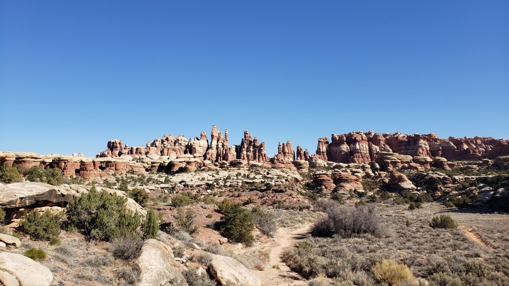 We headed down the cool trail for a it until it turned into a more normal nps trail. We had a lot of options for getting through the park. There’s a ton of alternates that take you through different canyons and creeks. We decided to take one that took us on a road through the center of the Needles area. We figured we’d spent enough time in canyons the past few days and were about to hike through several more in the next few so it would be nice to have some open views for a bit. The road was also mostly flat which made for some cruiser morning miles. The Needles up close are also super cool. We saw them from the distance last night and got pretty close. They are such weird looking geological formations. Some look like giant dildoes or bowling pins, other seems to defy gravity with how they stand up.