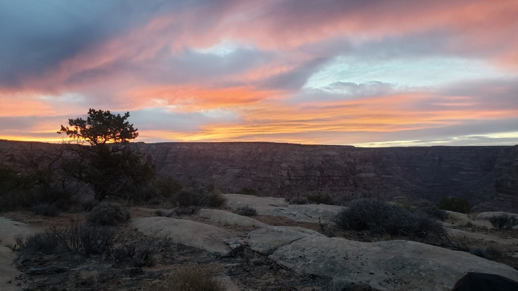 Glad we stayed near the rim of Dark Canyon last night, even despite the relentless wind that stirred up around midnight. Not that we had a choice trying to find a site in the dark. Morning sunset views were stunning. The sun lit up the canyon and it was startling seeing how deep it was and how high we had stumbled up last night.
