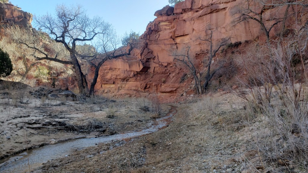 We stopped for a quick lunch and then went back to the slog. We finally reach a series of springs and the canyon turned into a flowing creek. We were initially relieved to be out of the soft sand and onto wet dirt (and sand) but that got old fast. The “trail” through this section was a bunch of cattle trails that went sometimes around and sometimes though the creek. Trying to follow it and keep our feet dry was such a pain, especially when it got overgrown with reeds. To make things worse, the entire area was fouled by cattle. We’ve hiked through and even camped in a ton of area full of cow shit but this canyon is by far the shittiest. It’s completely full of cow shit everywhere. We got water from a small pool and had to dump it out because it smelled and tasted like cow shit, even after pre filtering.