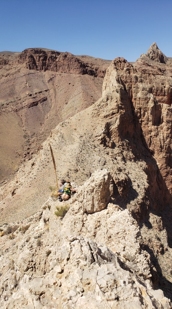 Despite how outdoorsy the others were, they didn’t have much experience with that kind of exposure. The climb up was pretty steep but fairly protected until right near the top. At the ridge we could peer over the other side to a pretty sharp drop. One of the guys, the one who had been in disbelief that we we’re going up, made it to the top after me but freaked out and death gripped a lower part of the ridge. He sat there in the fetal position for like 10 minutes freaking out. The older guy had to come up and talk him down. The spot he was in wasn’t that bad I thought but I guess people have different comfort levels with that kind of thing. I felt totally fine at the top and even stood atop a pillar on the ridge so I could take in the views better. This wasn’t as hard as some of the Sierra stuff I’ve done before and the exposure was nowhere near as bad as some of the climbs I’ve done (thinking of you SE Corner of Headstone Rock) so it felt pretty safe to me. On the way down we spotted a diagonal line that looked like it went up to the butte. Looked like more intense scrambling, maybe class 4 ish. Debated trying it out but everyone seemed ready to want to go back to camp so didn’t end up doing it. One more reason to come back some day.