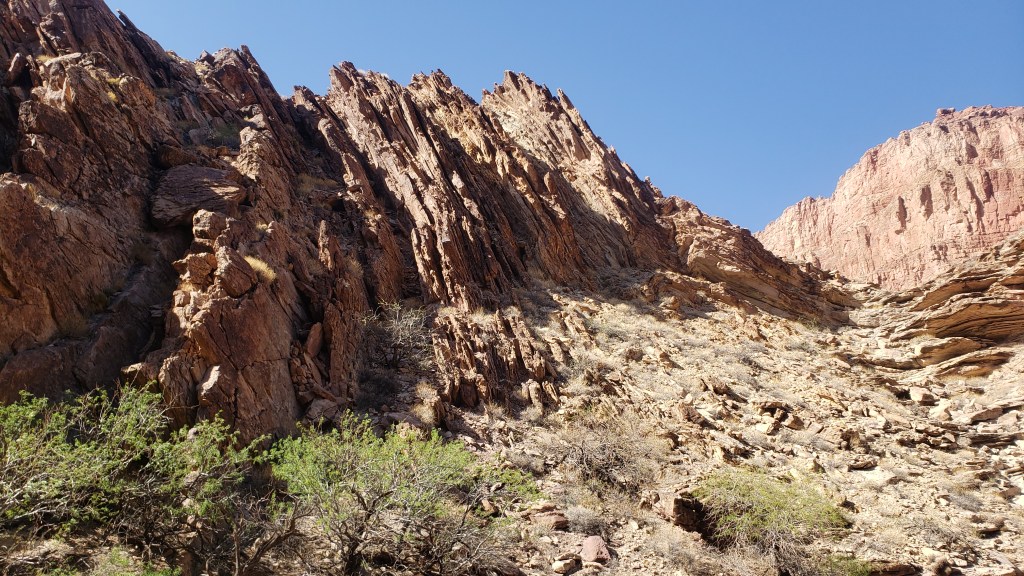 The way back to camp was through the same canyon. Still cool to see it, especially one really interesting section were the Tapeats ledges swoop up from vertical to horizontal. No idea how that happens but I’m guessing it has to do with the canyon opening up.