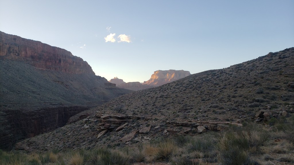 I got a bit ahead of Jordan and ate dinner while I waited for him. Caught a beautiful sunset on the canyon walls. Not quite alpenglow but still a warm pretty color. He caught up and had dinner then we hiked a bit more to a creek where there were a few people camped. It was getting pretty dark by then and we found a pretty good campsite near the creek so we called it a day there. We had initially planned to make it to the Horseshoe camp and the junction with the Grandview Trail but it wasn’t that much further to there. We can definitely knock that out early in the morning. Would give us more time to let cars show up for a hitch too.