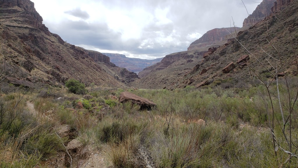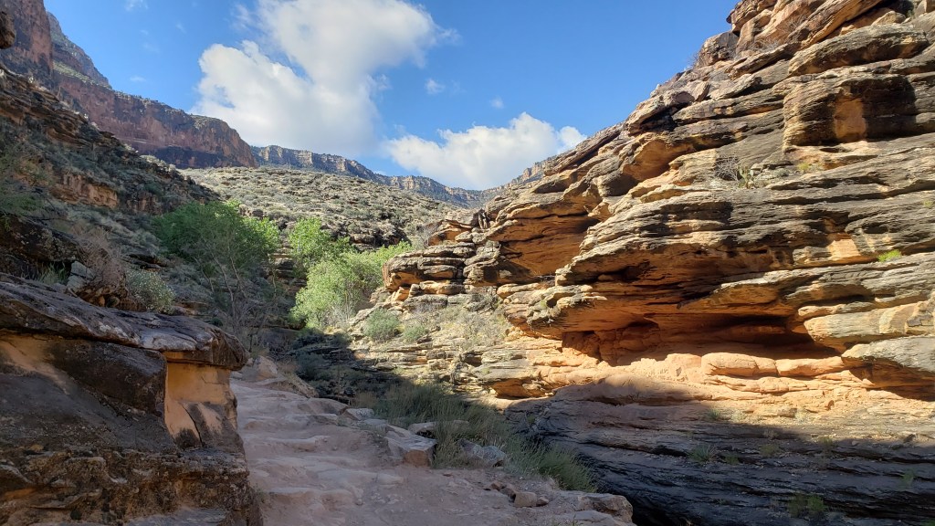 Crossed the bridge over the Colorado (no having to wait for a hitch this time) and made it to Phantom Ranch. Phantom Ranch was way too crowded for me. Jordan wanted to stay and maybe try to talk to some AZT hikers but I needed to get out of there. Once I got a mile or so away, there were substantially fewer people. The trail followed Bright Angel creek for a while so I got to hike through a beautiful canyon alongside rushing water by myself. I did get passed by a rim to rim to rim runner and did see a few maybe day hikers but for the most part, had some solid alone time.