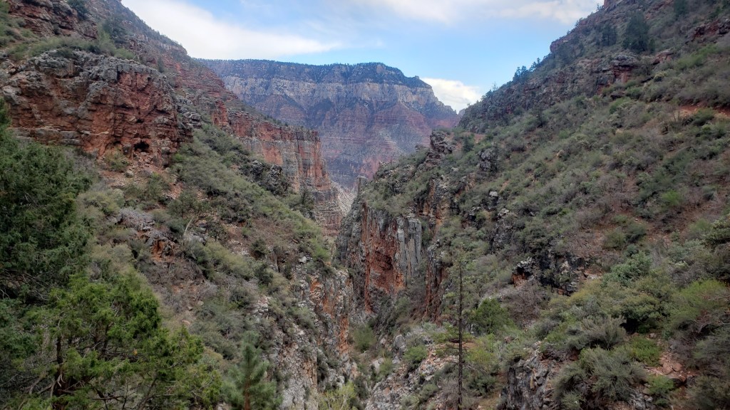 The north rim was still pretty much as snowy as it had been a few days ago (oh god that was only a few days ago) and a lot colder than the canyon floor. We expected that but it still sucked. We reached the campground and the thankfully on water fountain, our only reliable water source for the next 30 miles. Jordan and I somehow got separated here when he went to the bathroom and I spent way too long ambling around the campground trying to find him.