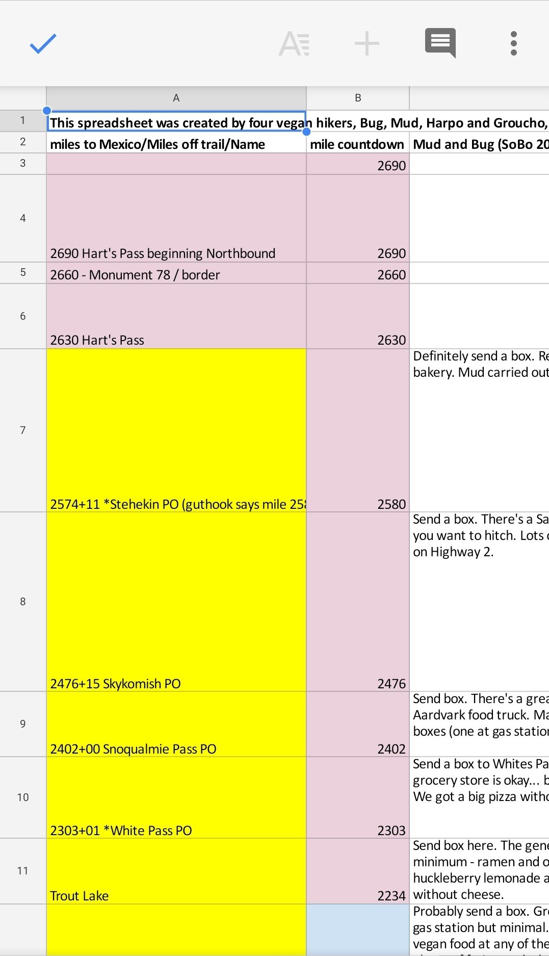 I downloaded Google Sheets and was able to update it from my phone as I hiked (please sponsor me Google). I was pretty conservative to start, only planning on hiking 20 miles a day but quickly stepped it up to 25, 27, and 30+ by the end of Oregon except in the Sierra where I mostly did 25s.